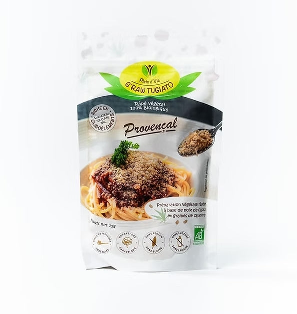 Ce râpé végétal cru et 100 % vegan est élaboré à partir de graines de chanvre décortiquées, de noix de cajou et d’un subtil mélange d’épices provençales.