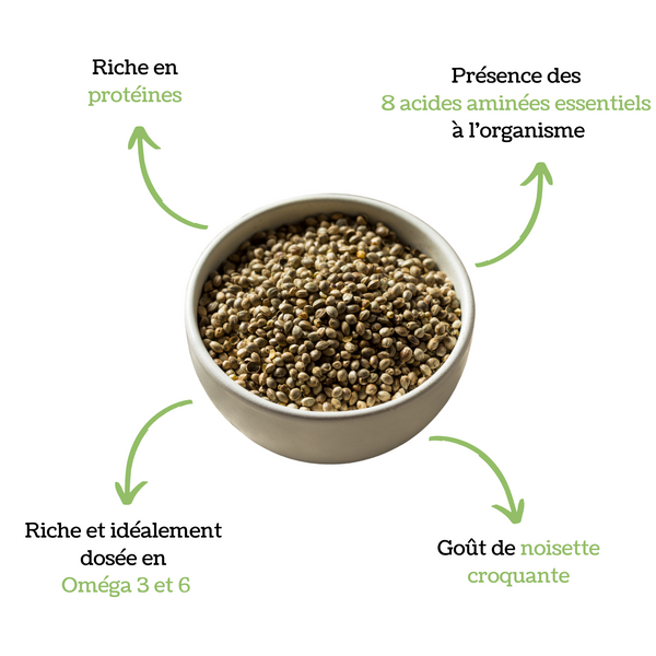 Cette graine possède tous les acides aminés essentiels (AAE) au bon fonctionnement de l’organisme mais que notre corps ne produit pas naturellement.