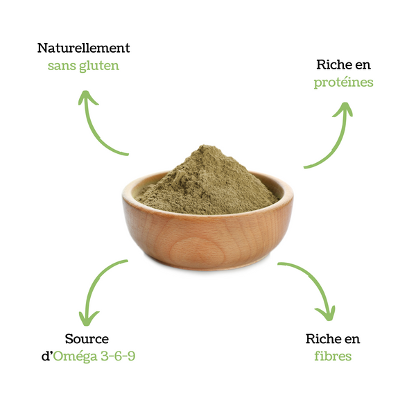 Issue d’une culture écologique, elle est idéalement dosée en oméga 3 & 6, riche en protéines (25%), fibres, vitamines et minéraux.