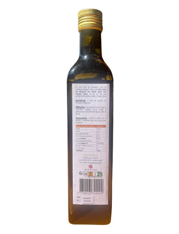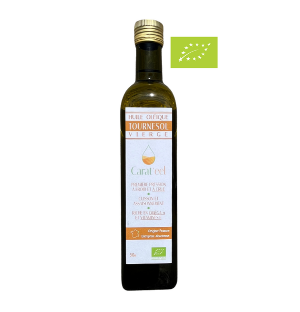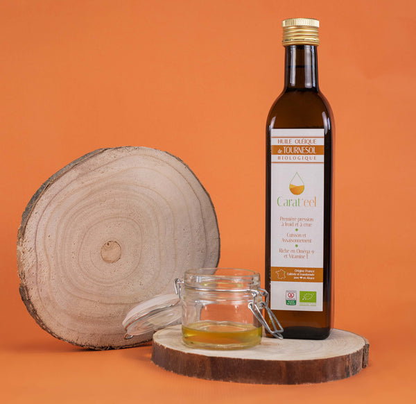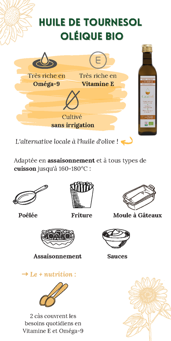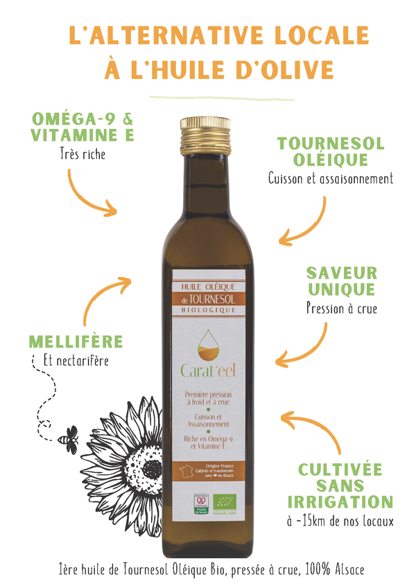 Ce n'est pas du tournesol, c'est du tournesol O L E I Q UE* ! Issue d'une agriculture durable et régionale, les graines sont pressées à froid et à crue (<42°C).